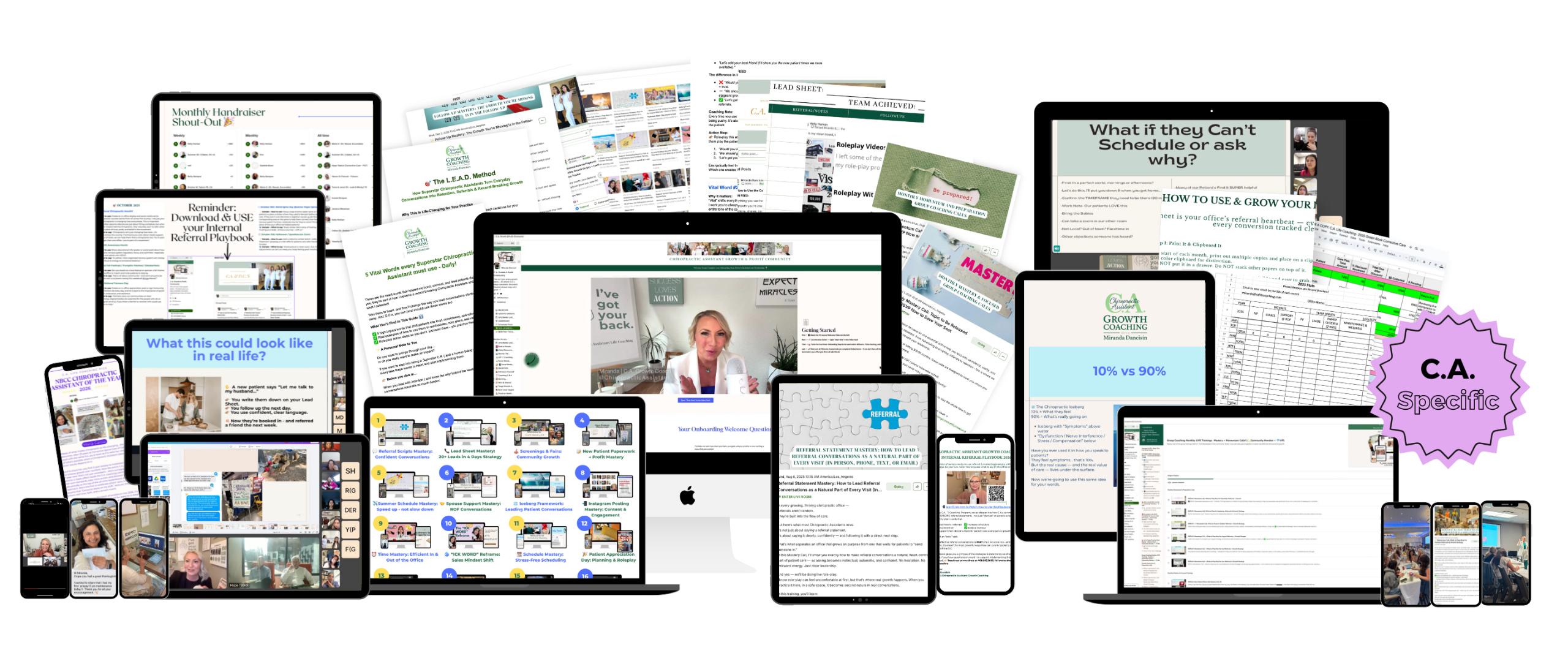 (New Patient Phone Call, Reactivations, Spouse @ ROF, Event Booth Mastery, Lead followup, Paperwork-to-profit steps, Etc) your C.A. becomes sharper, faster, and more instinctual in every conversation that drives your numbers.